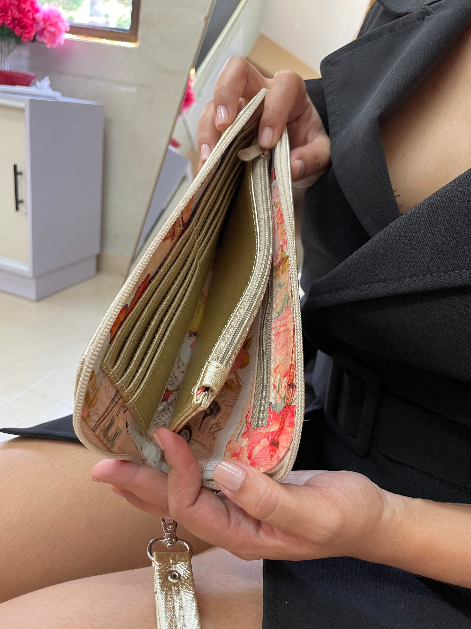 - Disfruta de un amplio espacio para tarjetas, billetes y más, manteniéndolo todo organizado.